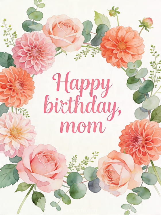 Share a loving birthday wish for your mom with this elegant floral card featuring pink and coral dahlias with eucalyptus on a soft cream background. Discover also mom birthday message, mom birthday card and happy birthday mom.