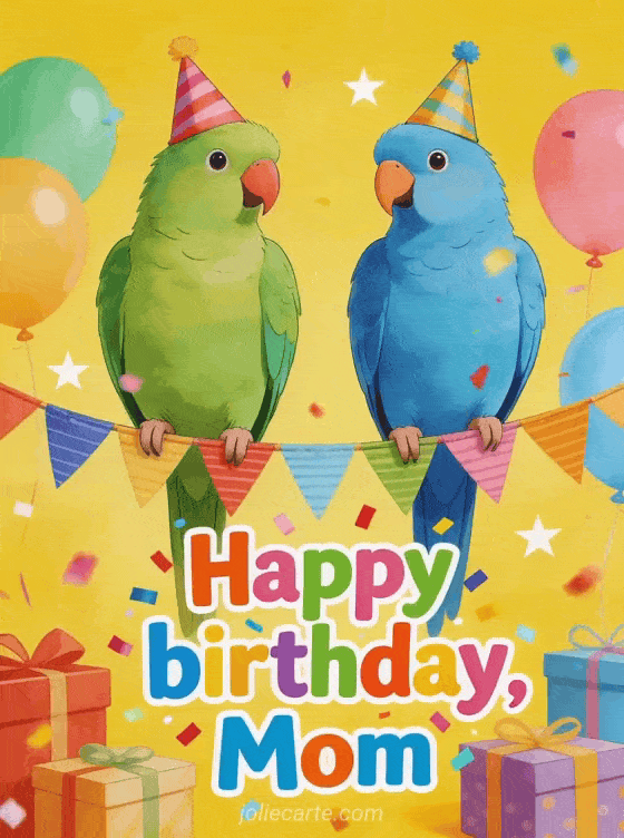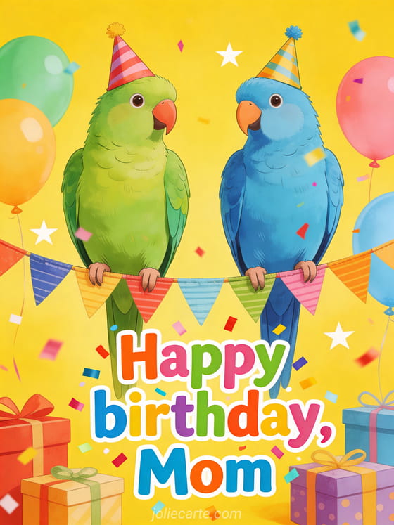 Wish mom a happy birthday with a cheerful drawing of two colorful parrots on party bunting, surrounded by gifts, balloons, stars, and a sunny festive background. You can also send a short birthday note for mom, a happy birthday card for mom, or a happy birthday mom heart card.
