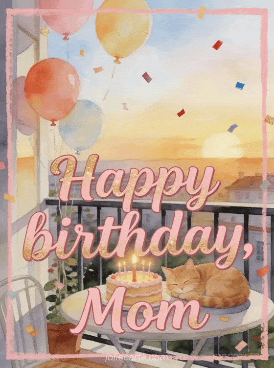 Share a warm birthday wish for mom with rosy hand lettering, subtle gold shimmer, a ginger cat, a candlelit cake, balloons, confetti, and a balcony table in a clear sunset glow. You can also send a happy birthday young mom card, a happy birthday mom animated image, or birthday wishes for mom.