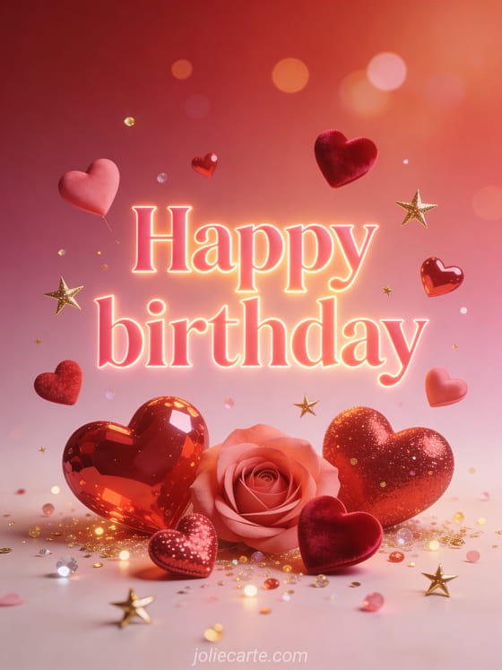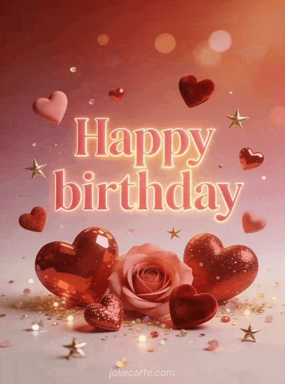 Share a loving birthday greeting for mom with pink lettering, red and pink hearts, golden sparkles, and a warm romantic glow. You can also discover a birthday card for one's mom, a happy birthday to one's mom card, or a birthday image for mom.