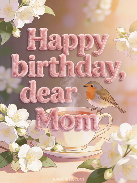 Share a soft birthday greeting for your dear mom with powder-pink lettering, a robin perched on a steaming tea cup, jasmine flowers, and a cozy warm atmosphere. You can also send a happy birthday mom I love you card, a free birthday card mom, or a happy birthday my sweet mom card.