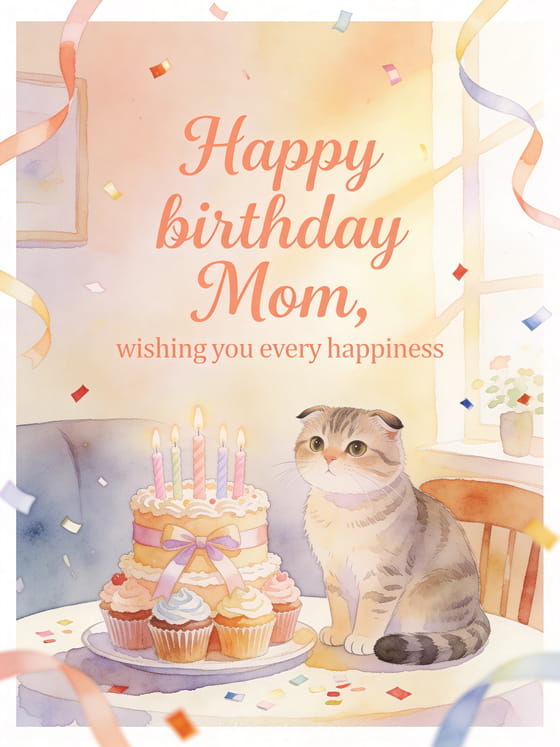 Send your mom a warm birthday greeting with peach script, a soft glow, and a cheerful watercolor table scene. You can also share a happy birthday mother-in-law text, an easy drawing for mom's birthday, or a free happy birthday mom card.
