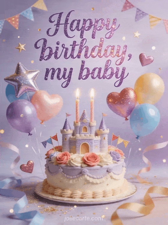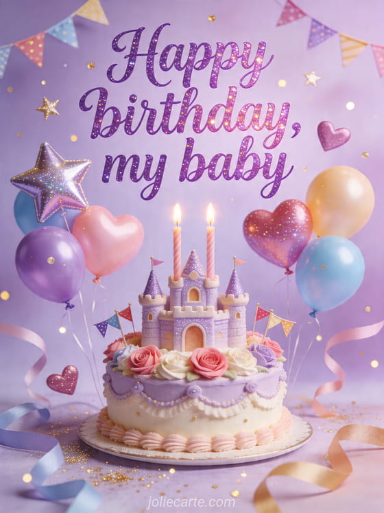 Celebrate a sweet second birthday with this enchanting card featuring a castle-shaped cake, colorful balloons, and festive ribbons. Discover also birthday text baby 1 year, happy birthday baby and happy birthday baby cat.