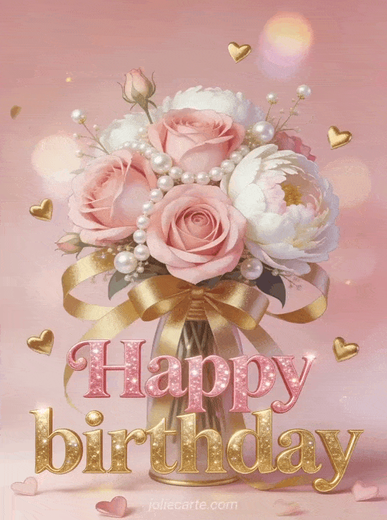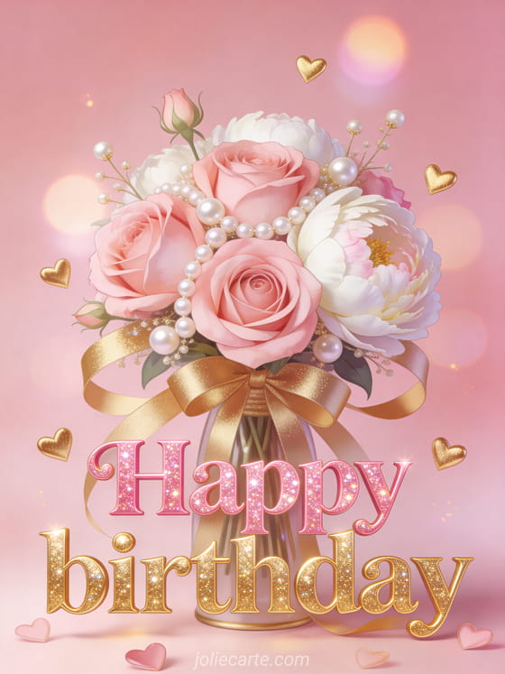 Celebrate with a graceful birthday card featuring pink roses, white peonies, pearls, golden ribbons, and soft light. You can also discover happy birthday on the water, happy birthday cat image, and happy birthday nanny.