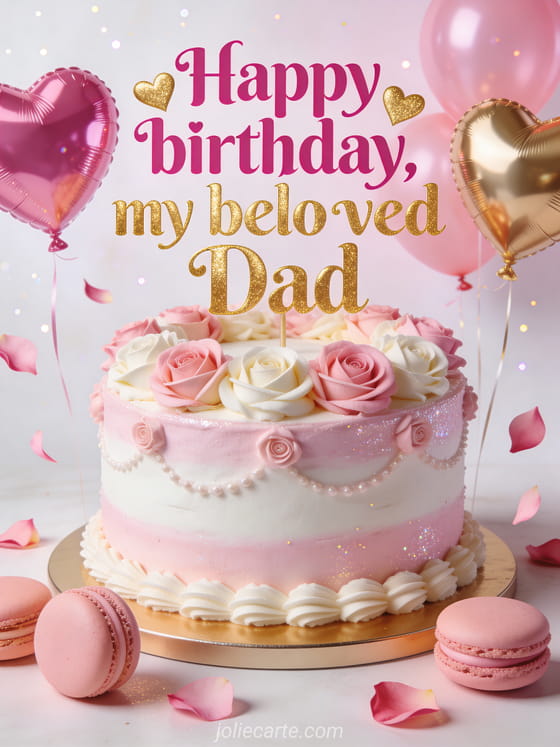 Celebrate your beloved dad with a soft photorealistic birthday card featuring a pink and white cake decorated with cream roses, pink macarons, pink and gold heart balloons, falling rose petals, and a sparkling pale pink background. Discover also happy birthday to dad, happy birthday my dad, or happy birthday dad love.