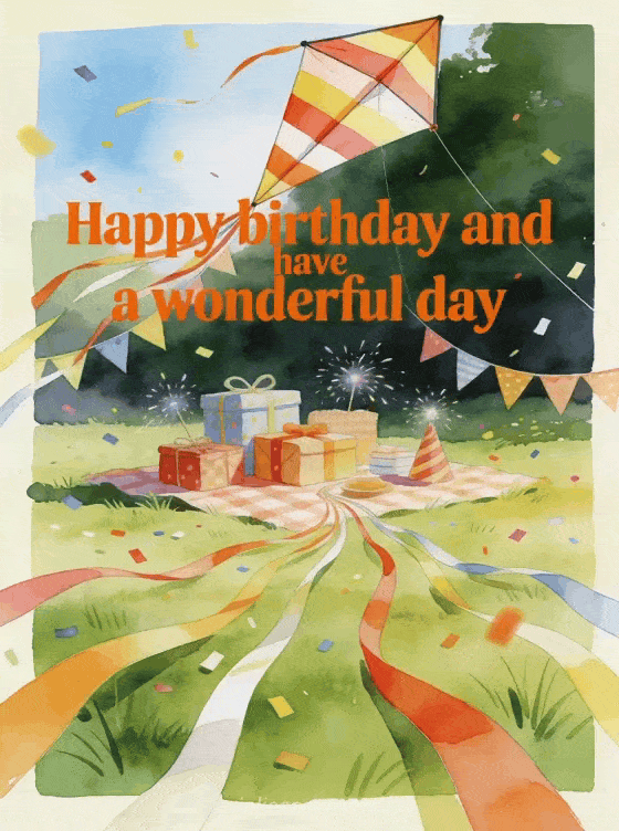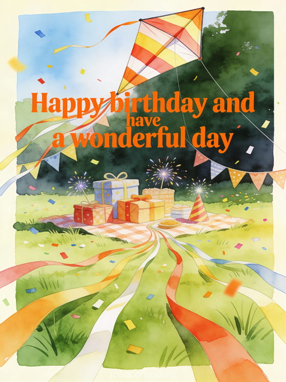 Send a cheerful birthday greeting with a playful watercolor scene full of movement and color. A giant striped kite rises over a meadow picnic with gifts, bunting and sparkling confetti, creating a warm way to wish him a wonderful day.