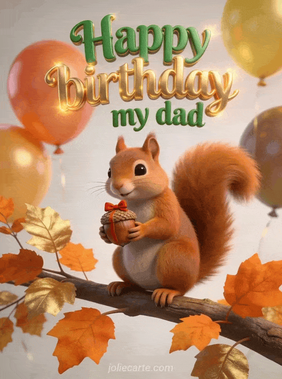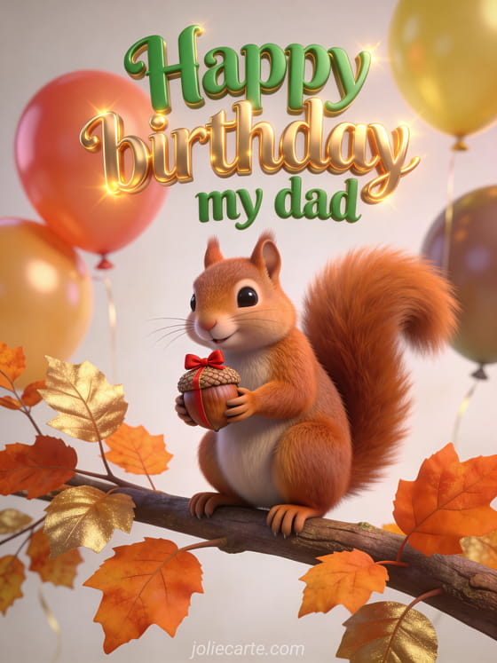 Celebrate your dad with a bright birthday card featuring a cute squirrel, autumn leaves, and festive balloons. You can also discover birthday dad text message, happy birthday dad image, or birthday message for dad.