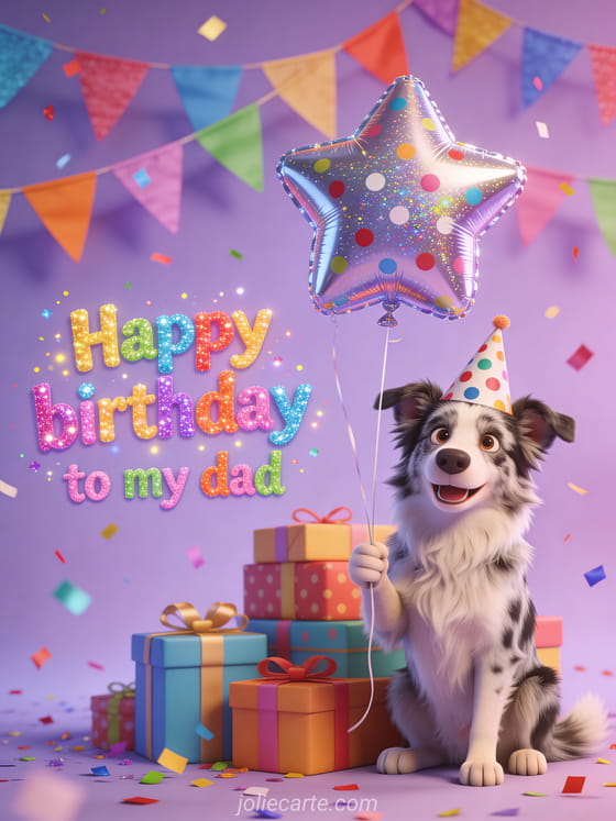 Celebrate dad with a cheerful 3D-style illustration of an Australian shepherd wearing a polka-dot party hat, holding a star-shaped balloon, with stacked gifts, colorful bunting, multicolored confetti, and a bright lavender background. Discover also happy birthday dad love, happy birthday father-in-law poem, or happy birthday dear dad poem.