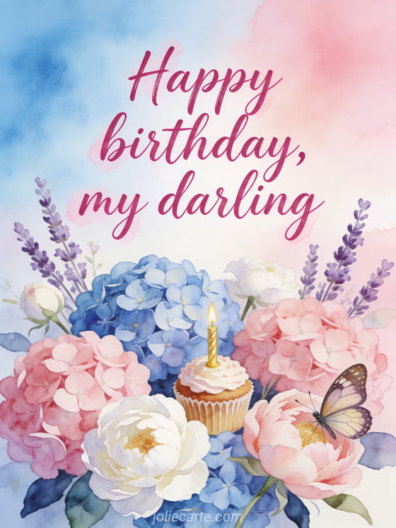 Send a tender romantic birthday greeting with a watercolor bouquet of blue and pink hydrangeas, white peonies and lavender. A small birthday cupcake and a butterfly add a delicate festive touch. Discover also a glamour happy birthday image, a happy birthday heart or a happy birthday my sweetheart image.