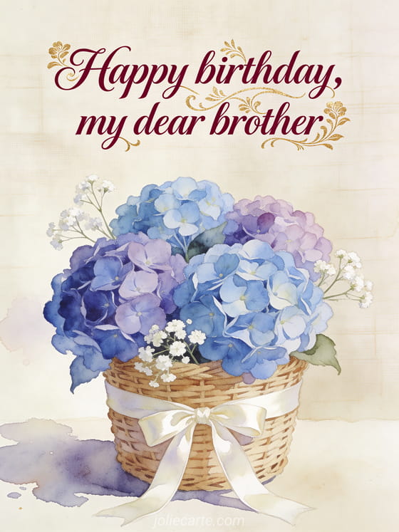 Send your dear brother a refined watercolor birthday card with blue and mauve hydrangeas in a woven basket, white gypsophila and an ivory satin ribbon. You can also share a birthday brother gif, a brother birthday quote or a my brother happy birthday bro humor card.