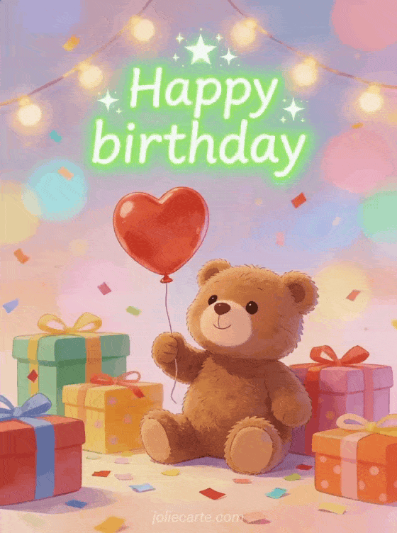 Share a sweet birthday card with a small brown teddy bear holding a red heart balloon, surrounded by colorful gifts, confetti and light garlands on a pastel bokeh background. You can also send a birthday card for a brother, a bro happy birthday my brother gif or a happy birthday little brother gif card.