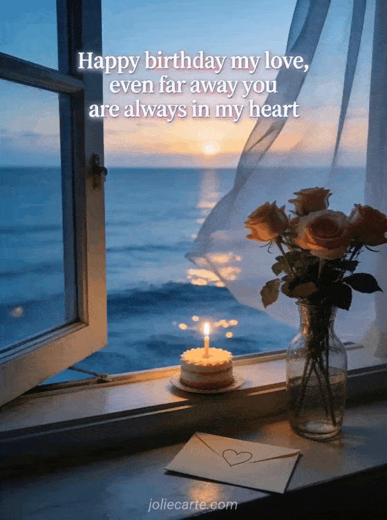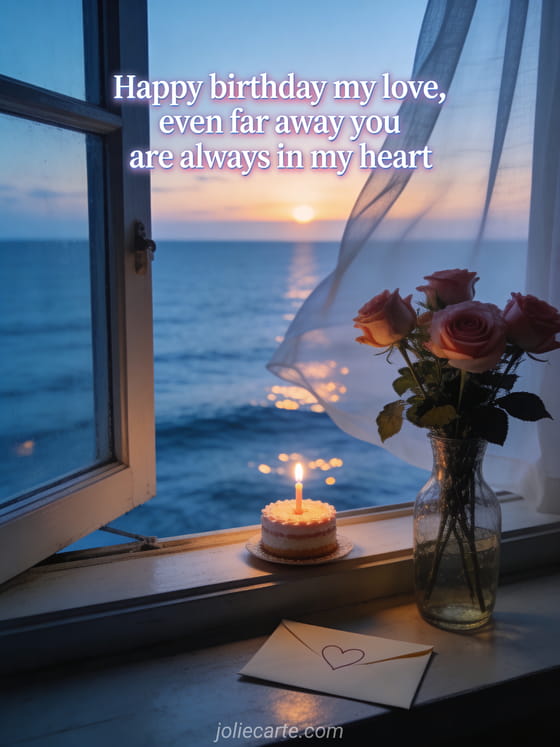 Share this touching long-distance birthday message for your love and keep your bond close. Discover also a heart heart happy birthday my love, a birthday message for my boyfriend or a happy birthday card sweetheart.