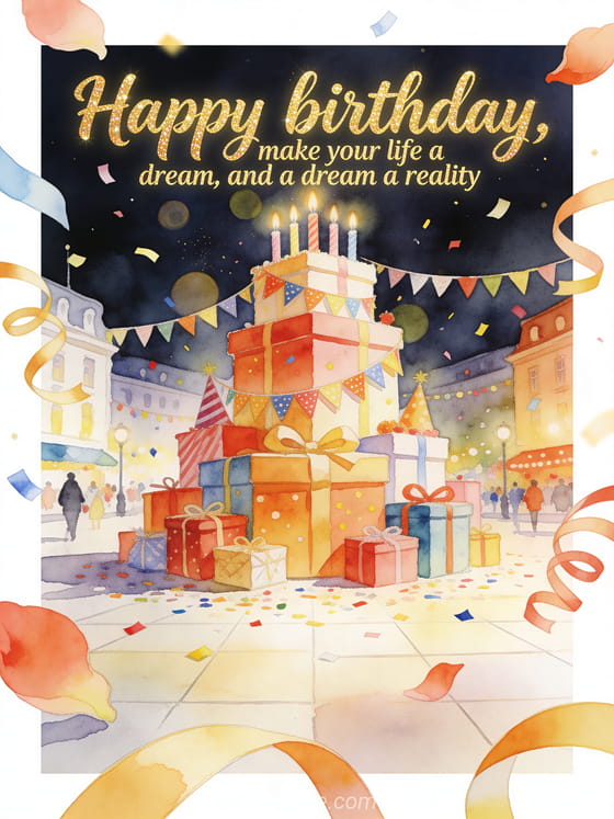 Send an inspiring birthday card with a bright watercolor celebration built around a towering stack of gifts, candles, bunting and floating confetti. The message invites your son to make his life a dream and his dream a reality. Discover also a birthday for a son or a happy birthday my big boy.