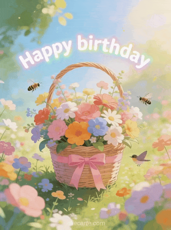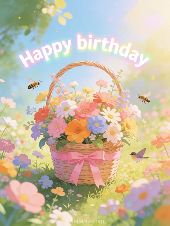Send this happy birthday nanny card with a pretty basket of colorful spring flowers with a pink ribbon, birds and bees in a sunny garden. Discover also a birthday wishes phrases or a happy birthday and have a wonderful day.