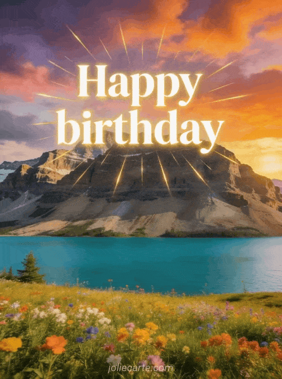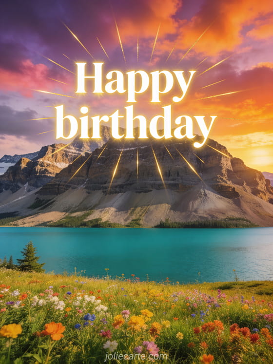 Send a breathtaking happy birthday greeting with a stunning mountain and lake landscape. Luminous white letters with golden rays shine above a spectacular sunset sky. Discover also a cute happy birthday gif card.