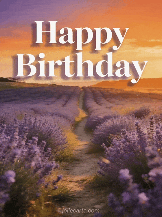Send this beautiful happy birthday greeting featuring a stunning countryside landscape at sunset with a path lined by lavender fields under an orange and purple sky. Discover also a vintage car birthday card or a birthday ecard.