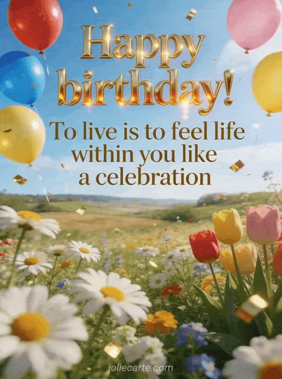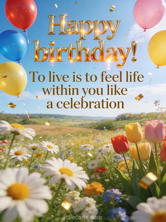 Send a beautiful happy birthday message with a vibrant quote about life and celebration. Colorful balloons floating above a blooming countryside set the festive mood. Discover also a happy birthday life love dream quote or a write a birthday message.