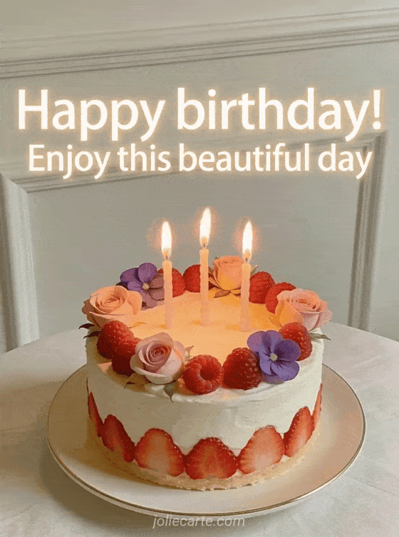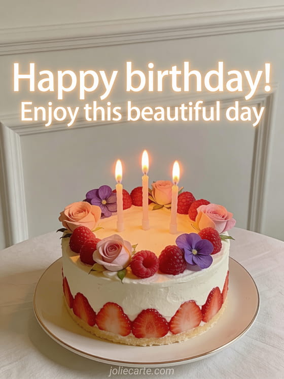 Share a happy birthday sms with a refined card featuring delicious cake, candles, and delicate pastel atmosphere. Discover also happy birthday beach, happy birthday car, and happy birthday wishes.