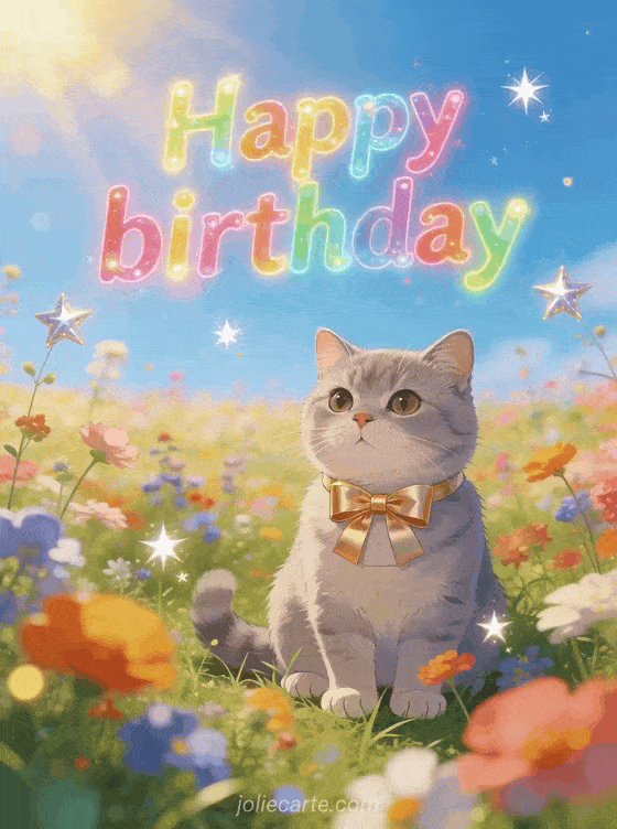 Share a luminous birthday card with an adorable gray British shorthair cat sitting among colorful wildflowers, wearing a golden gift bow under a bright blue sky. Discover also a happy birthday my son animated gif, a birthday card for my son, or a happy birthday son gif.
