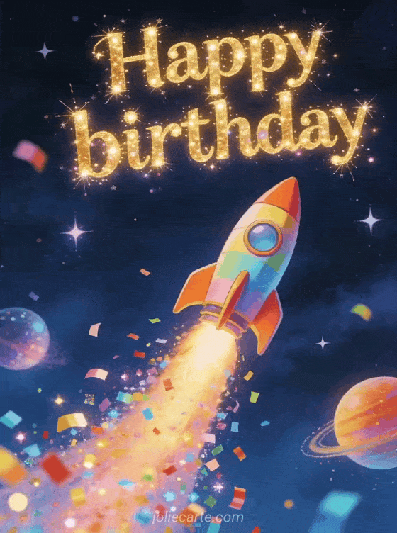 Share an energetic birthday card with a colorful rocket taking off through a deep night sky, leaving a trail of confetti and glitter among planets and stars. Discover also a happy birthday boy gif, a happy birthday my beloved son, or a happy birthday message son.