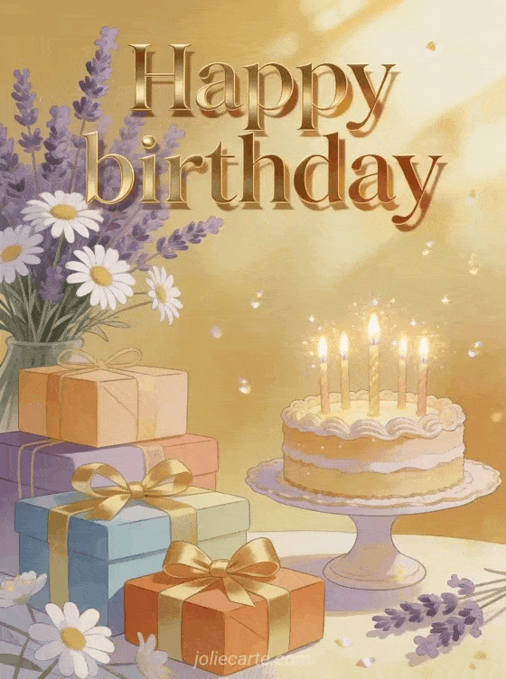 Send a happy birthday stepdad card with classic golden lettering, lavender and daisies on a warm golden background, colorful gifts, lit birthday candles and an elegant cake. Discover also dad I wish you a happy birthday, a happy birthday dad card or happy birthday dad animated images.