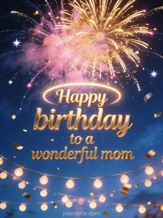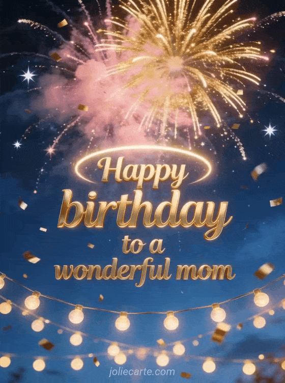 Celebrate a wonderful mom with warm golden lettering, a spectacular burst of gold and pink fireworks in a deep blue night sky, sparkling stars, falling golden confetti, and glowing light garlands. You can also send an animated happy birthday mom, a happy birthday mom card, or a happy birthday card for a young mom.