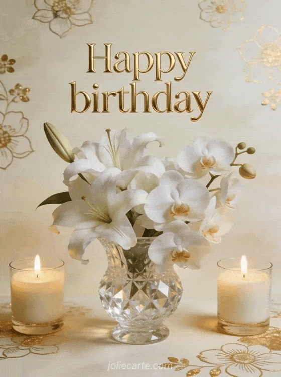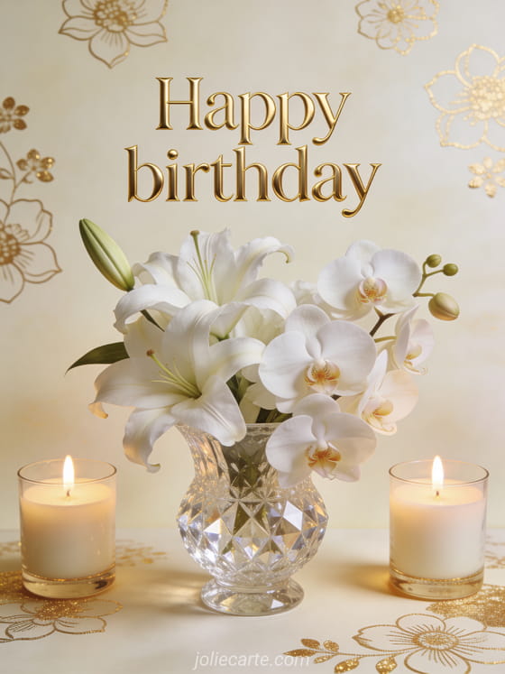 Share warm and sincere birthday wishes with a refined arrangement of white lilies and orchids in a crystal vase. Discover also a happy birthday flowers card or happy birthday gifs.