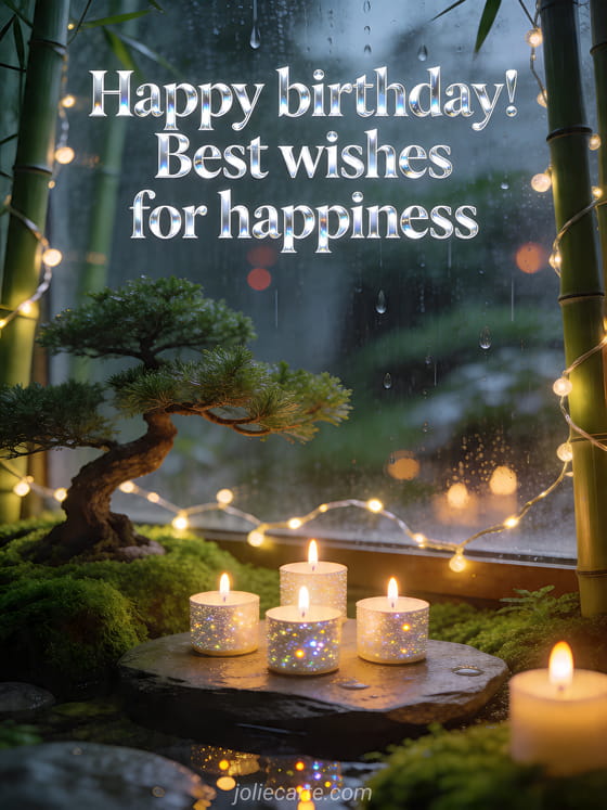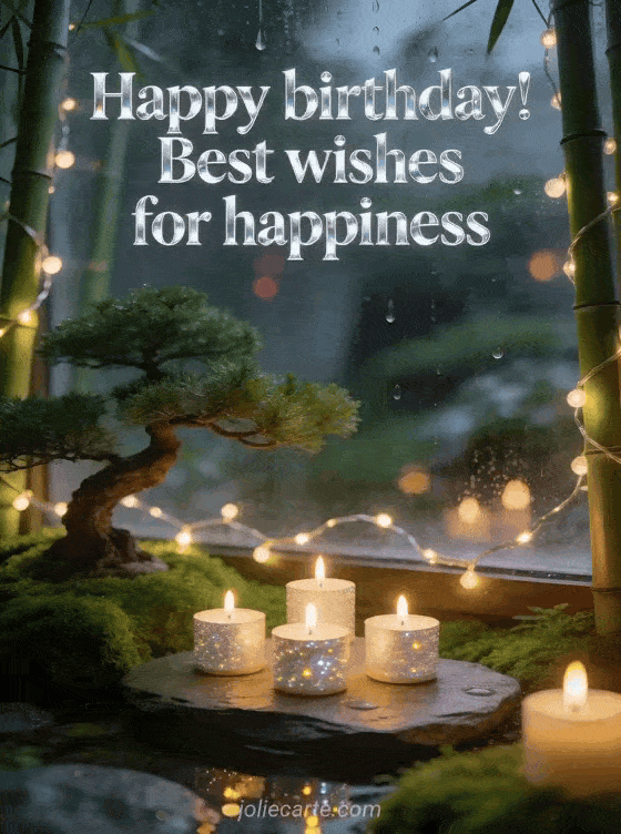 Share peaceful happy birthday wishes with this soothing card featuring a zen garden, a bonsai, glowing candles, and warm lights among the bamboo. Discover also flower happy birthday, letter to wish happy birthday and virtual happy birthday frog card.
