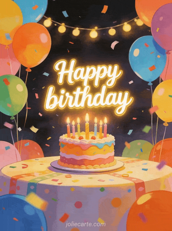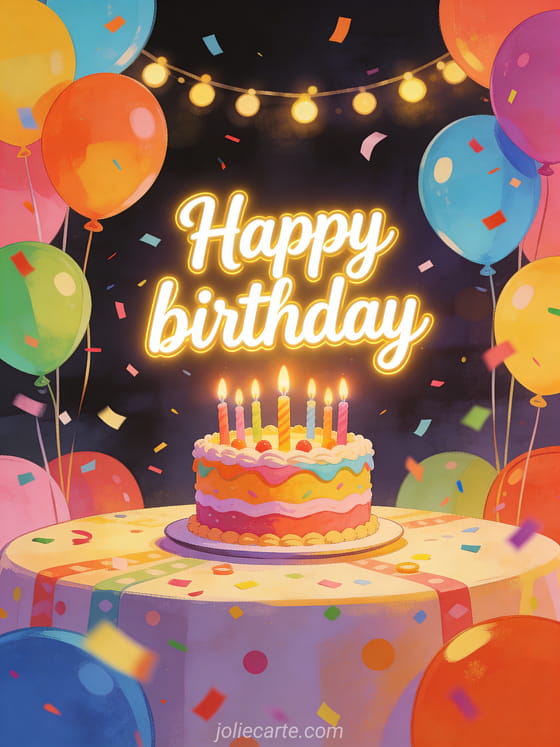 Celebrate with a happy birthday card full of colorful cake, candles, balloons, and flying confetti in warm golden light. Discover also sms to wish a happy birthday, happy birthday letter, and happy birthday ecard.