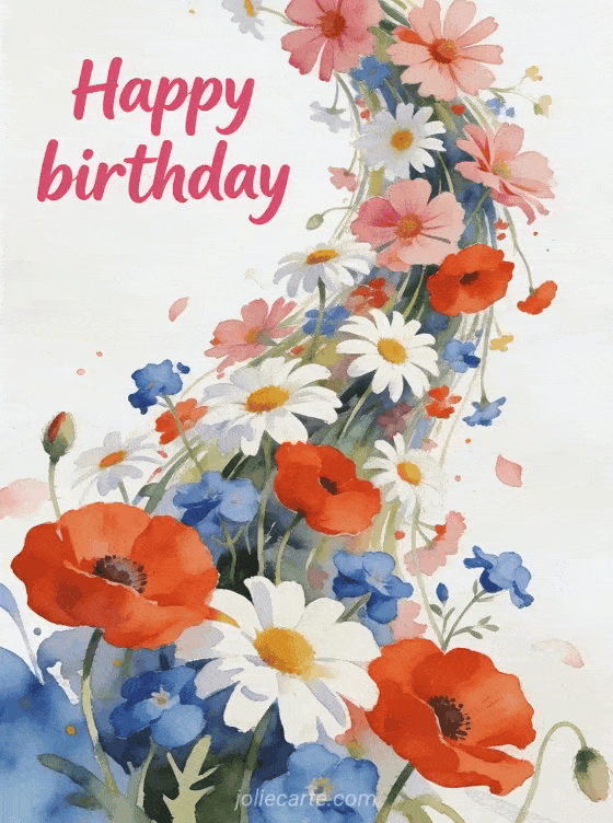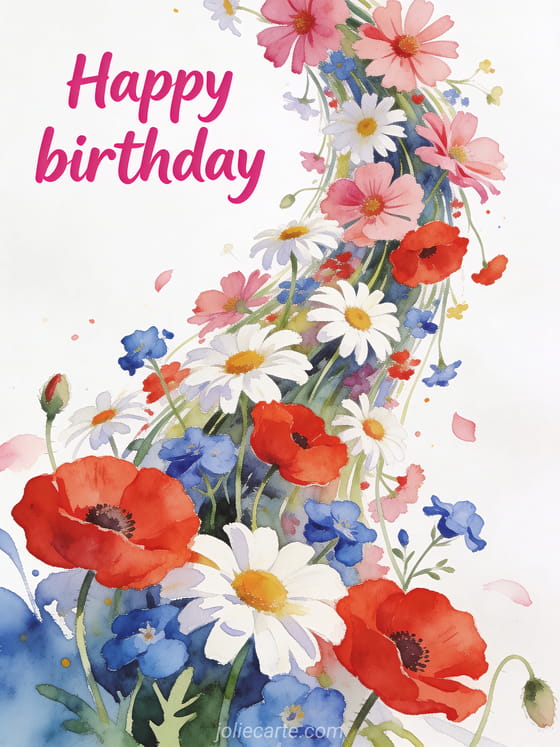 Celebrate with a vibrant birthday card where cosmos, daisies, poppies, and wildflowers fall in a festive floral cascade. You can also discover birthday card woman champagne, happy birthday woman photos, and birthday woman free.