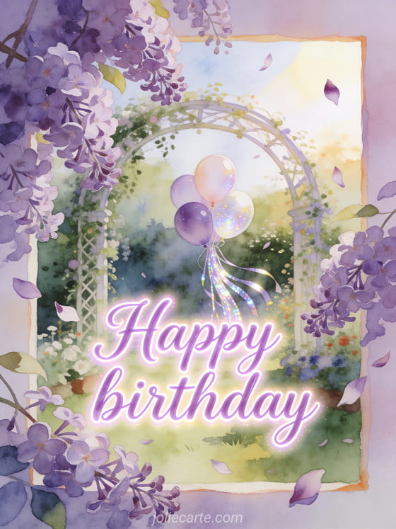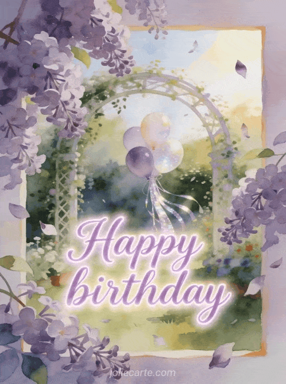 Share a graceful birthday greeting with glowing lavender script, fragrant lilac clusters, drifting petals, a garden arch, a balloon bouquet, and shimmering streamers in sunny pastel light. You can also send a happy birthday mom animated image, birthday wishes for mom, or a sparkling happy birthday mom gif.