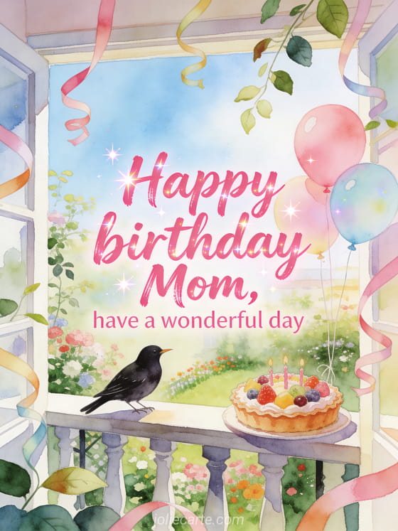 Share a happy birthday young mom image with a blackbird near pastel balloons and a fruit birthday tart in a bright balcony garden. You can also send happy birthday dear mom gif, happy birthday mom gifs or happy birthday my sweet mom image.