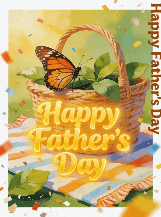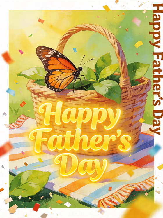 Send a happy day to dad card with sunflower yellow lettering, a lively acrylic illustration of a monarch butterfly on a woven picnic basket, green leaves, striped cloth and bright confetti. Discover also a card for father's day, a Father's Day poem my heart tells me or a free fathers day card.