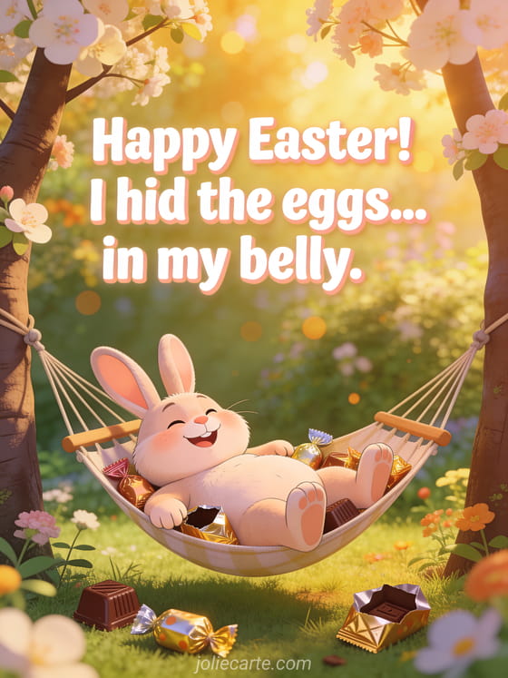 Share a great laugh this Easter with this hilarious card about a bunny who ate all the chocolate eggs. Discover also a funny Easter humor card for even more laughs.