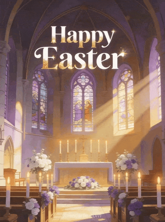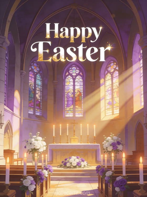 Share a beautiful happy Easter christian card with a church filled with divine stained-glass light and lit candles. Discover also a religious Easter or a happy Easter religious.
