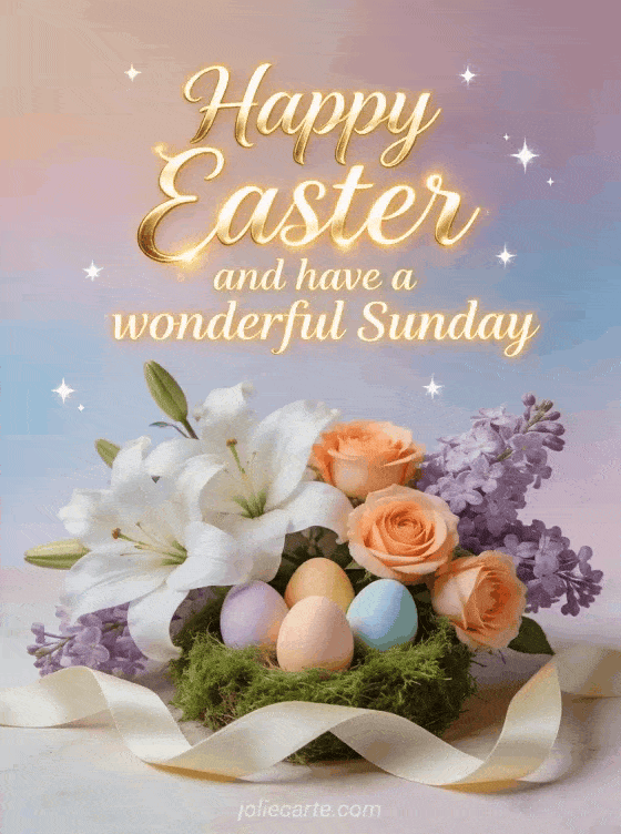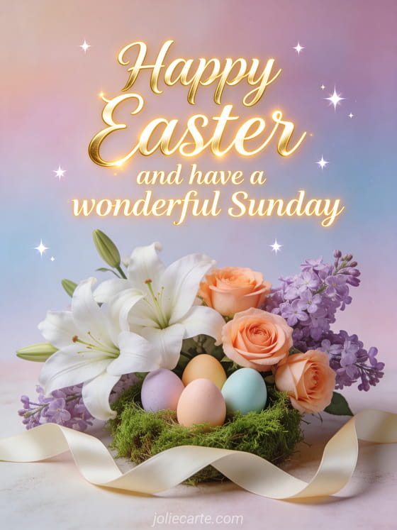 Wish a happy Easter and a wonderful Sunday with this elegant card featuring white lilies, peach roses and pastel Easter eggs. Discover also a happy Easter weekend card, a happy Easter Sunday card or a happy Easter Monday card.