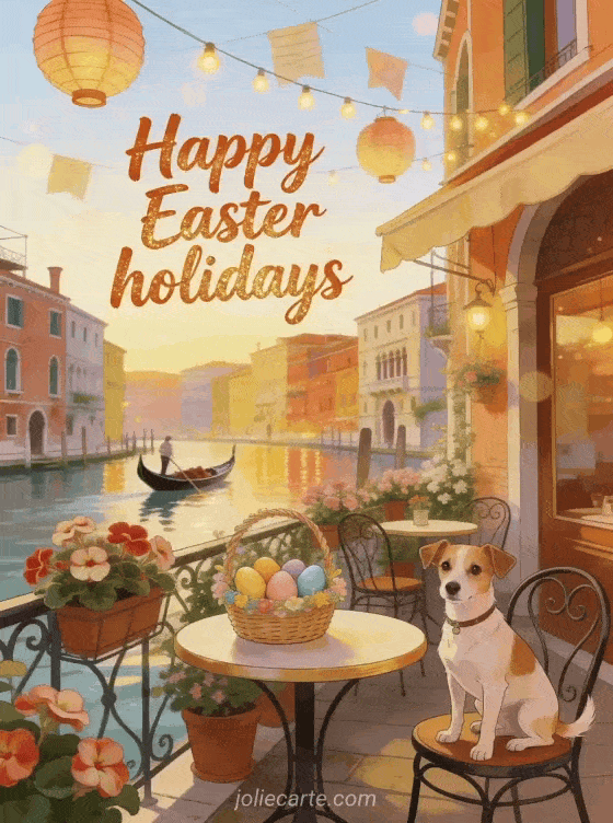 Send a beautiful Happy Easter holiday card with a Venetian canal-side café decorated with painted Easter eggs. Discover also free Easter images or a Happy Easter message.