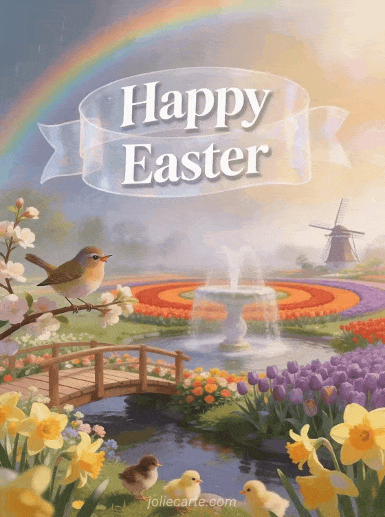 Celebrate Easter with this charming animated greeting card featuring a warbler singing on a flowering branch beside a Keukenhof garden fountain with tulip beds, a wooden footbridge, and baby chicks among daffodils with a rainbow.