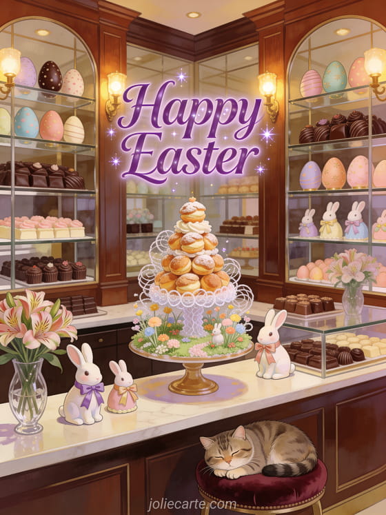 Share this beautiful Happy Easter image featuring a charming Scottish Fold cat with Easter eggs and spring flowers. Discover also free Easter wishes or Happy Easter images.