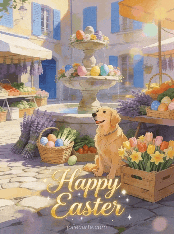 Happy Easter images a sunny Provençal market with Easter eggs and a golden retriever