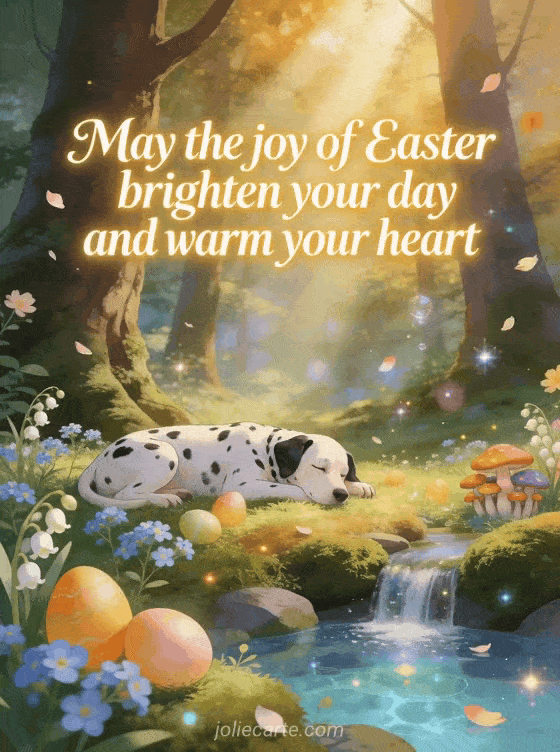 Share this tender Happy Easter message with a Dalmatian dog in a spring forest with lily of the valley. Discover also Happy Easter animated gif or free Easter gif.