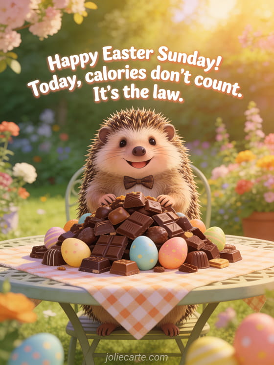 Share a laugh this Easter Sunday with this comic card featuring an adorable hedgehog sitting blissfully in front of a mountain of chocolates and Easter eggs. Discover also a happy Easter Sunday card, Easter Monday wishes card, or beautiful Easter weekend image.
