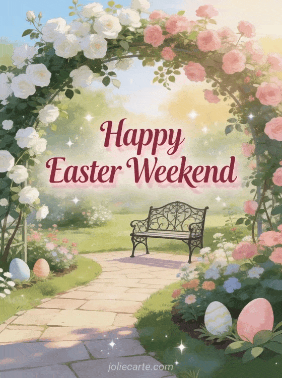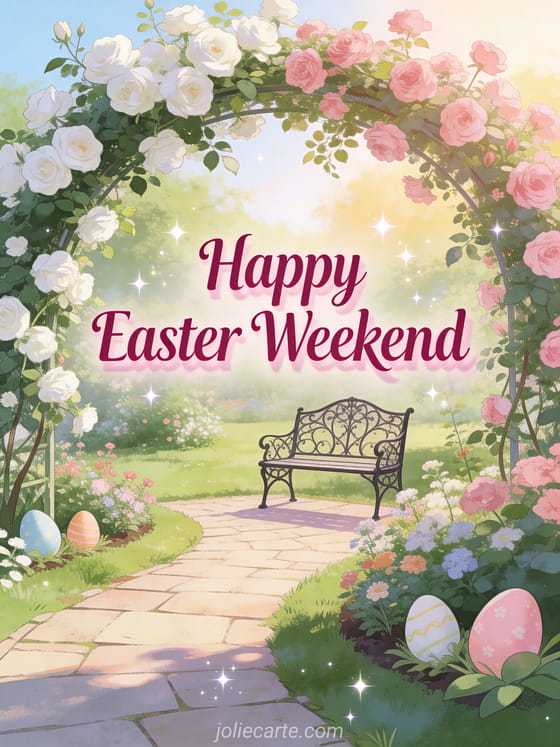 Wish a happy Easter weekend with this romantic card featuring a lush English garden with climbing roses, a wrought iron bench, and Easter eggs hidden among the flowers. Discover also a happy Easter weekend card, beautiful Easter weekend image, or Easter weekend greeting.
