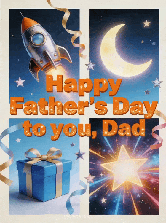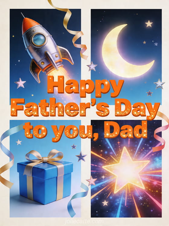 Send Dad a playful illustrated Father's Day card with a retro rocket, crescent moon, blue gift box and a starry sky filled with bright bursts. This energetic design is perfect for a cheerful greeting. Discover also a Dad Father's Day card, free Father's Day card or happy father's day dad image.