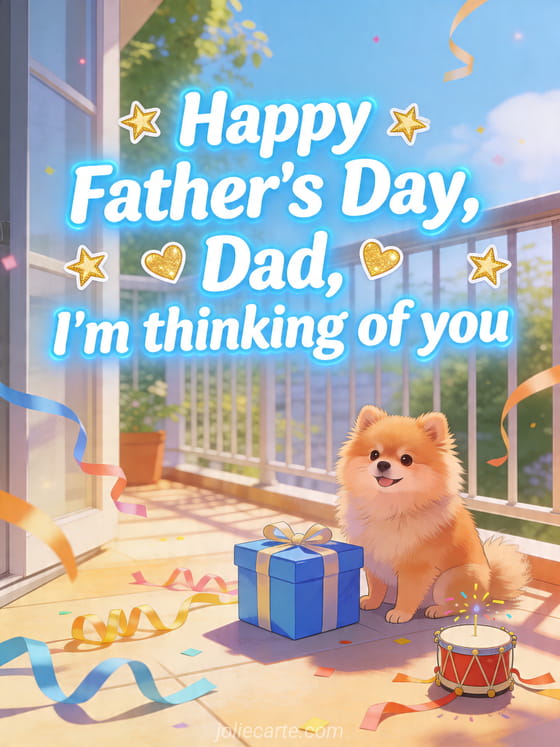 Send a tender happy Father's Day dad text with rounded glowing lettering, small hearts, golden stars, a Pomeranian beside a blue gift box, streamers and a tiny celebration drum on a sunny balcony. Discover also happy mother's day mom and happy father's day dad, a free happy father's day card or the best father's day card.
