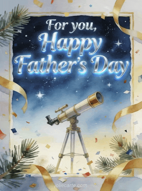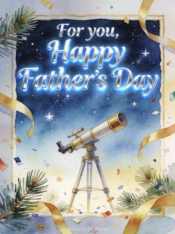 Send happy father's day for my son with luminous silver lettering, a gouache illustration of a small telescope under a bright starry summer sky, pine sprigs, golden streamers and festive confetti. Discover also a pretty Father's Day card, happy father's day to all dads or father's day I miss you.