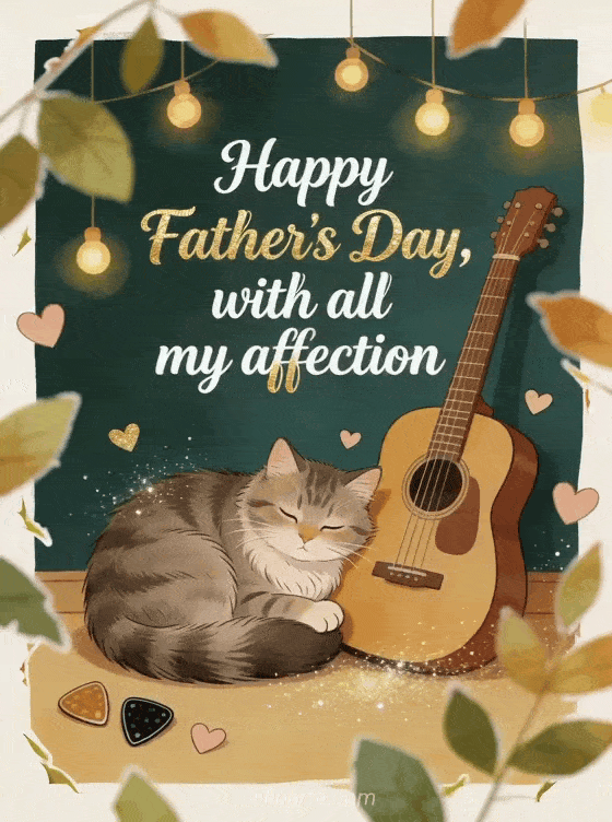 Send a tender happy Father's Day image with a cozy storybook illustration of a Norwegian forest cat curled beside an acoustic guitar under warm hanging lights, tiny hearts and leaf shapes. Discover also loving words for father's day, a Father's Day poem or poem happy father's day dad kindness and tenderness.