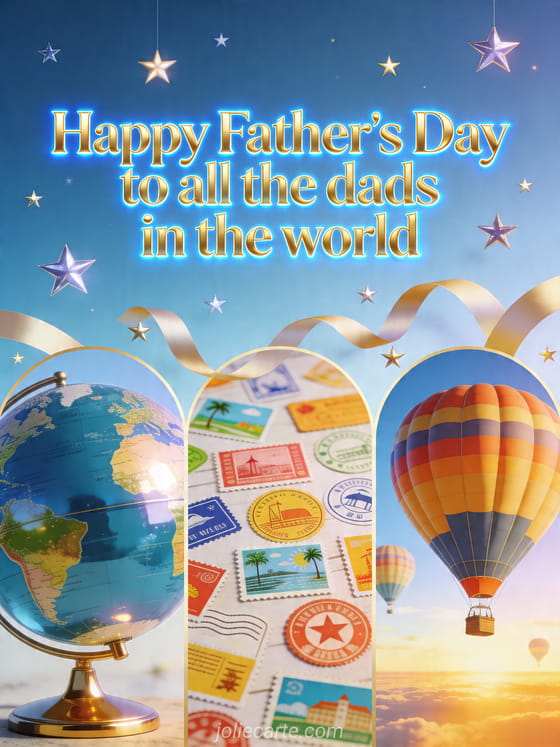 Celebrate all dads around the world with a joyful illustrated collage featuring a polished globe, colorful travel stickers and hot air balloons over a bright horizon. Discover also a papa's day card, a love love poem for Father's Day or happy fathers day.