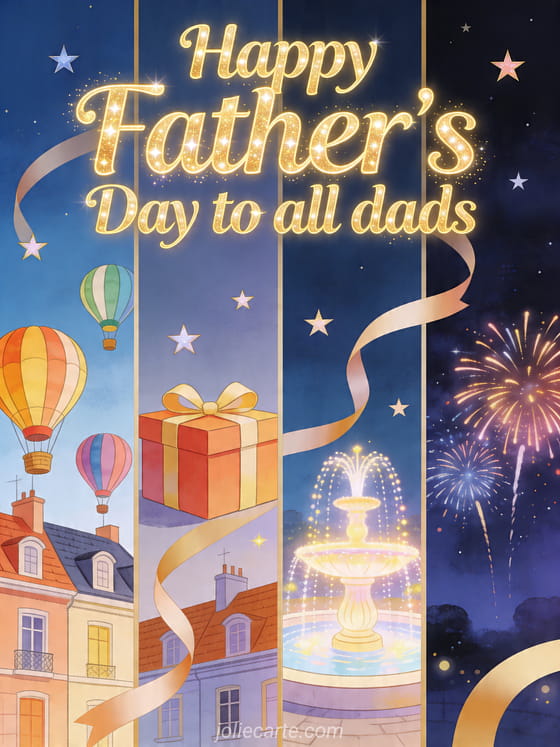 Celebrate every dad with a detailed illustrated card featuring colorful hot air balloons above rooftops, a gift box, a bright fountain and a night sky with fireworks. This generous, festive design is made to share widely. Discover also father's day I miss you, a joyful father's day card or a Father's Day card template.