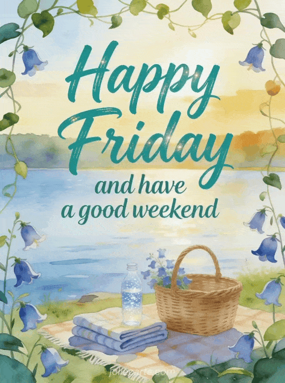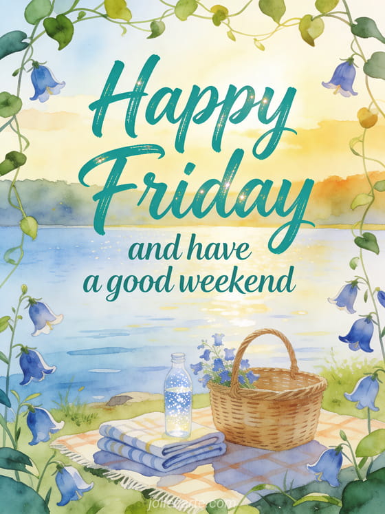Share a relaxed end-of-week wish with a watercolor lakeside picnic scene, bellflowers, a wicker basket, folded blanket and sparkling water. You can also send happy Friday cards, share text to wish a happy Friday or choose happy Friday butterfly image.